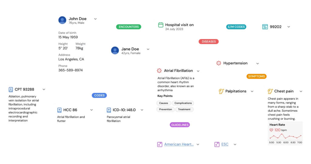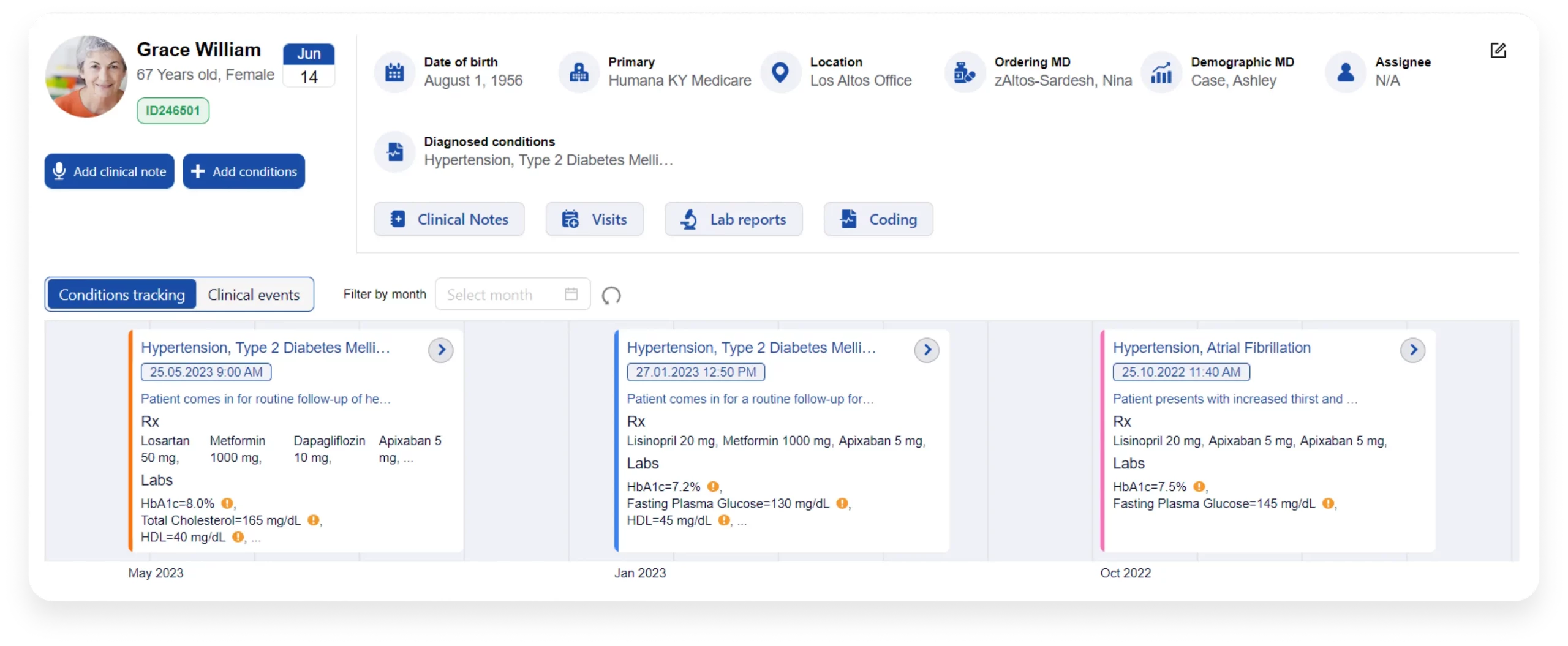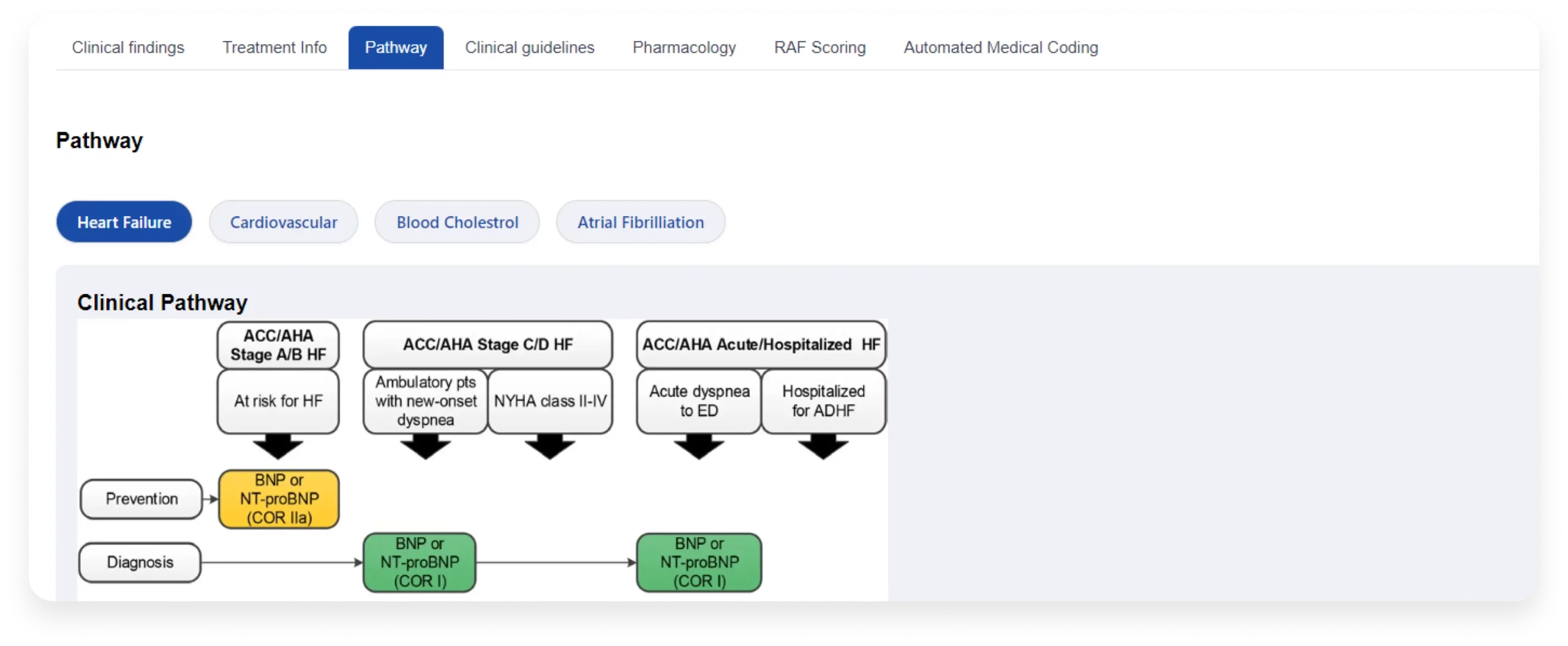 When patient arrives, the Prognosis dashboard is setup for the cardiologist with the time line view of the conditions, guidelines referring to the condition, ICD 10 codes,